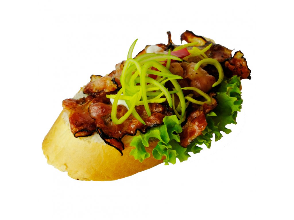 Chlebíček s křenovou pomazánkou obložený opečenou anglickou slaninou a pórkem. Alergeny: 1, 3, 7 Složení: veka, křen, pomazánkové máslo, anglická slanina, pórek, majonéza
