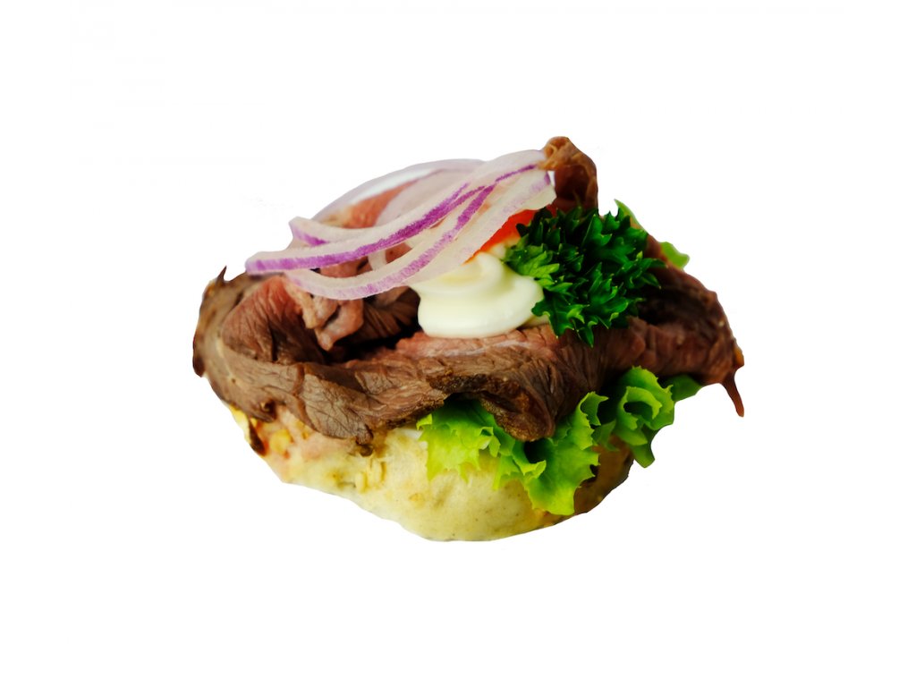 Balení 5 ks kanapky s tatarkou obložená roastbeefem a cibulí.